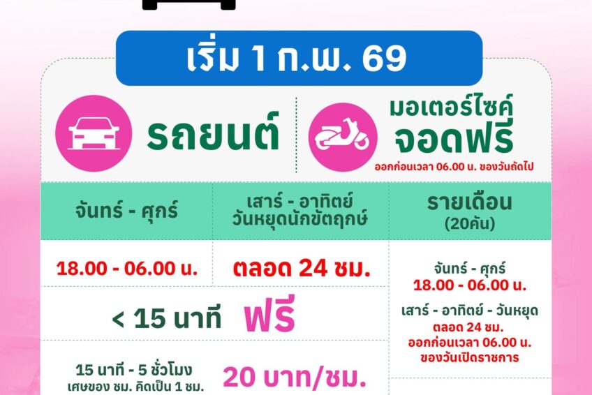 จอดฟรี 15 นาที 15 นาที - 5 ชั่วโมง : 20 บาท/ชั่วโมง ชั่วโมงที่ 6 ขึ้นไป : 30 บาท/ชั่วโมง มอเตอร์ไซค์จอดฟรี